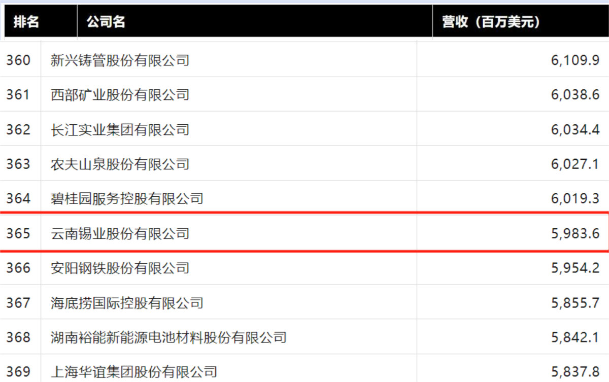 錫業股份上榜2024年《財富》中國500強位列365名