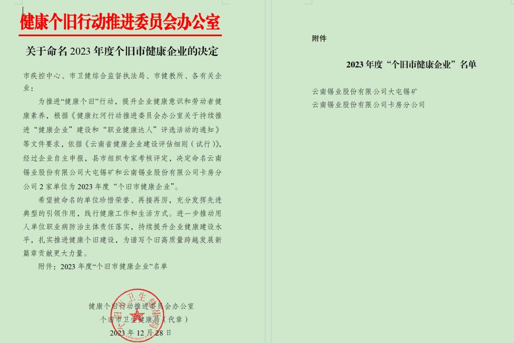 錫業股份兩家單位獲評2023年度“個舊市健康企業”