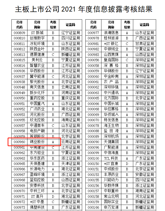 7月4日,深圳證券交易所發(fā)布了《2021年度上市公司信息披露考核結(jié)果》,錫業(yè)股份(000960)考核評(píng)價(jià)結(jié)果為最高等級(jí)A級(jí),自2017年之后再次回到信息披露考核最高等級(jí)陣營(yíng)。從考核結(jié)果統(tǒng)計(jì)來(lái)看,深市上市的2,553家公司中考核結(jié)果為A(優(yōu)秀)的公司家數(shù)僅為454家,占參加考核上市公司總數(shù)的17.78%。其中,云南轄區(qū)考核結(jié)果為A的深市上市公司僅有5家。