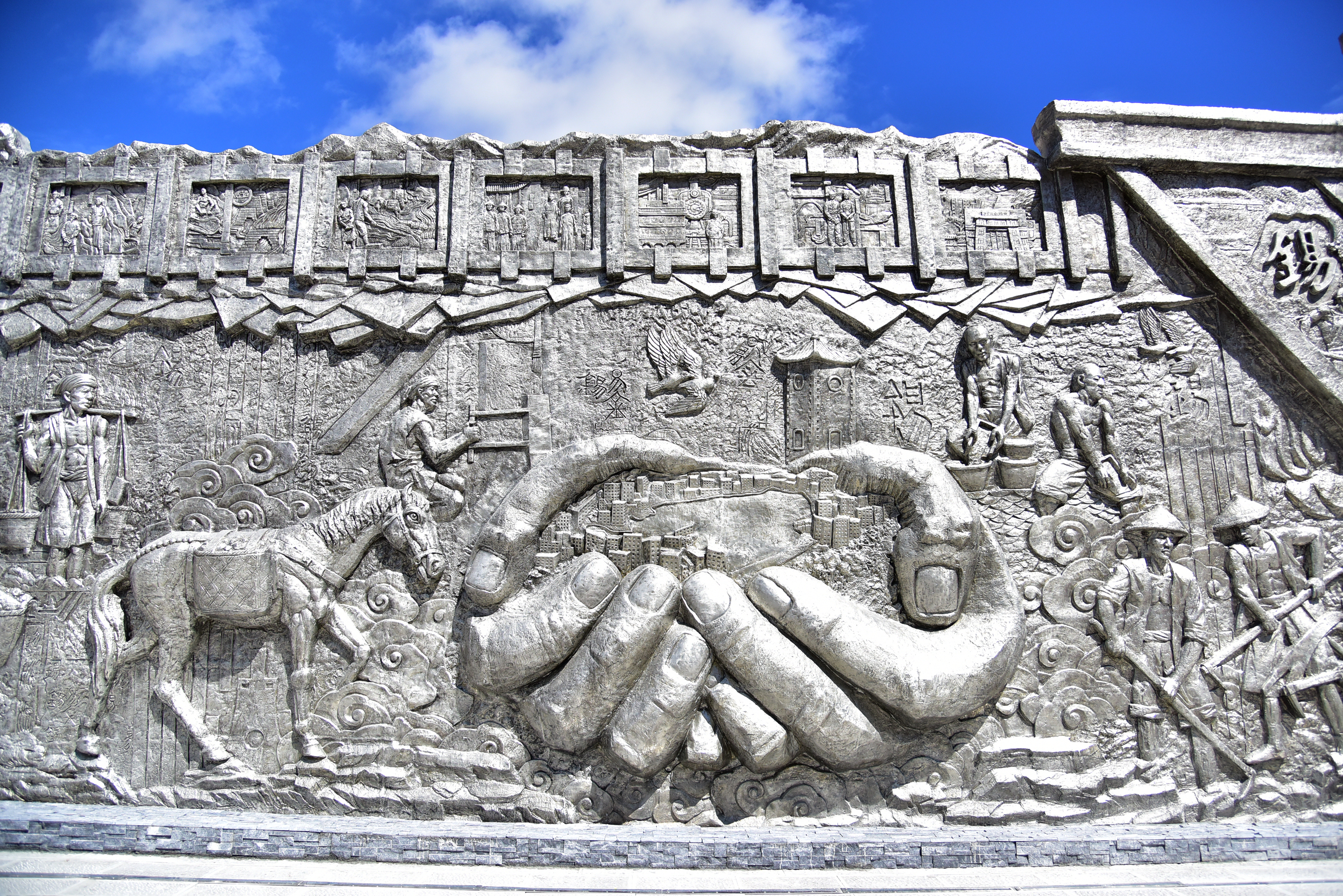 錫文化浮雕原料整體采用云錫冶煉分公司生產的“三九”精錫,由云錫騰升工藝品公司的100多名職工純手工打造,整個墻面使用精錫近40噸。墻體以云錫標志“YT”為核心,以“錫映千秋”“云騰萬里”為主題,分立于云錫個舊辦公區大門口兩頭雄偉的錫獅子一側。穿越時空隧道,沿著歷史軌跡,翊翊如生的錫業先輩和錫礦工人、科技人員,充滿動感的錫采、運、選、冶生產場景……一幅燦若星河的巨型錫業發展畫卷通過高浮雕藝術的方式展開。