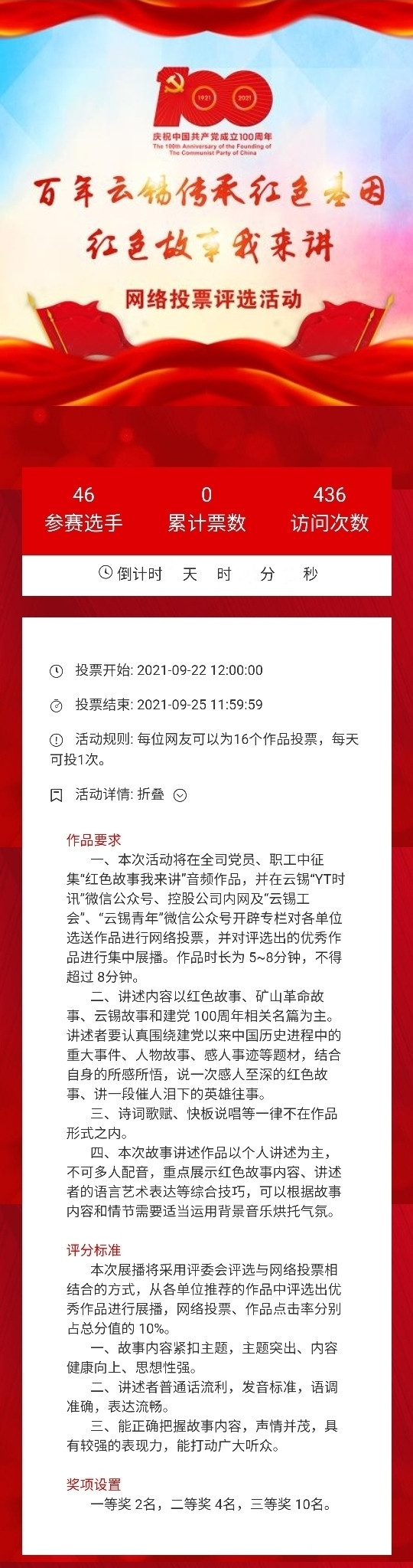 百年云錫傳承紅色基因——“紅色故事我來講”作品展播是云錫控股公司第32屆礦工節(jié)·文化月系列活動之一,經(jīng)各單位精心組織,“紅色故事我來講”音頻作品征集工作現(xiàn)已完成,從9月22日12:00至9月25日12:00為網(wǎng)絡(luò)投票時間,敬請廣大干部職工積極參與并發(fā)動身邊的親友參與投票,一起選出心中的優(yōu)秀作品。