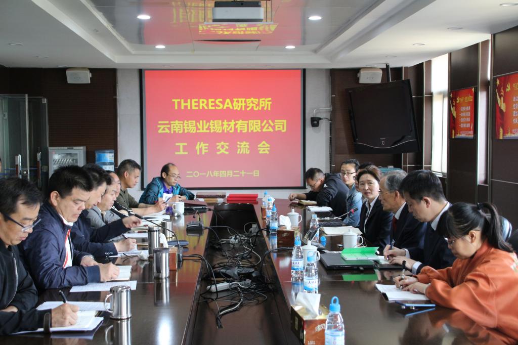 4月21日,錫材公司與日本THERESA研究所工作交流會暨“長谷川正行工作室”揭牌儀式在昆明總部舉行。THERESA研究所社長長谷川正行、助理成田辰彥,錫材公司黨委書記、董事長王鵬飛、總經理白海龍、副總經理劉寶權、張欣以及相關技術人員和管理人員50余人參加交流會和揭牌儀式。