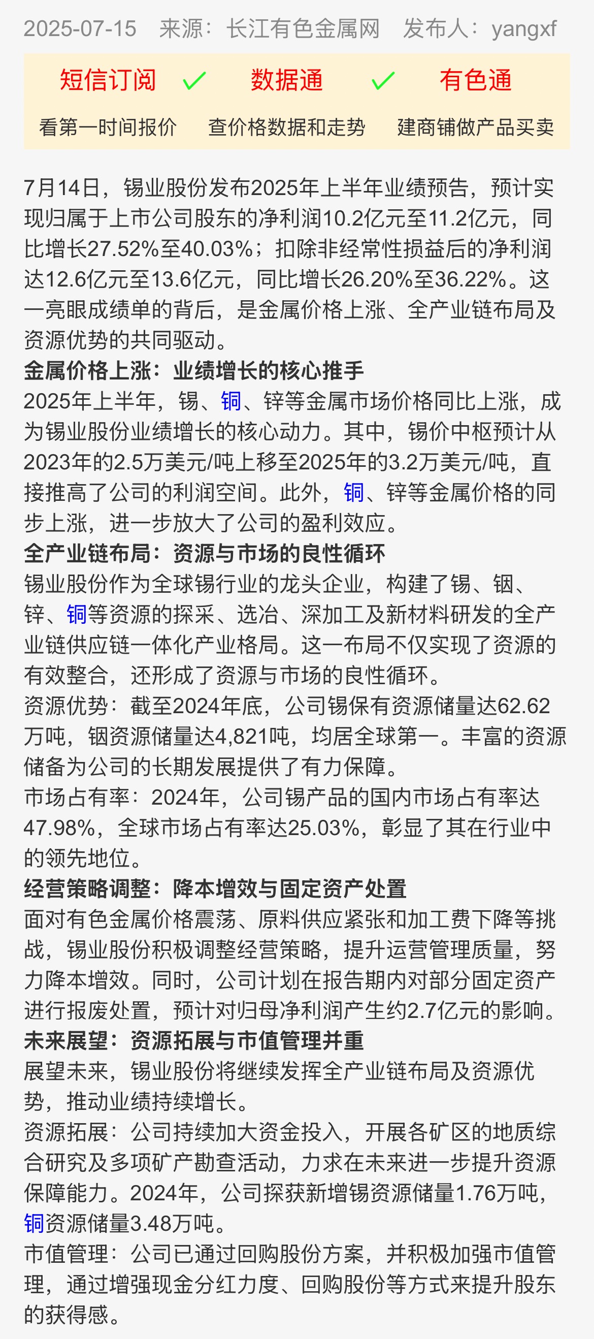 長江有色金屬網:半年凈利破10億!金屬價格飆升+全產業鏈優勢,錫業股份為何能領跑行業?