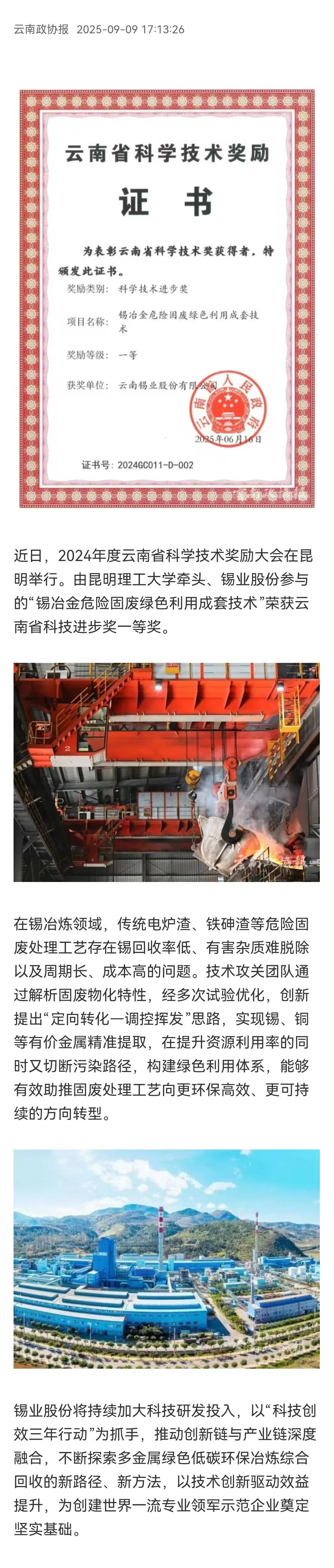 云南政協報:錫業股份榮獲云南省科技進步獎一等獎