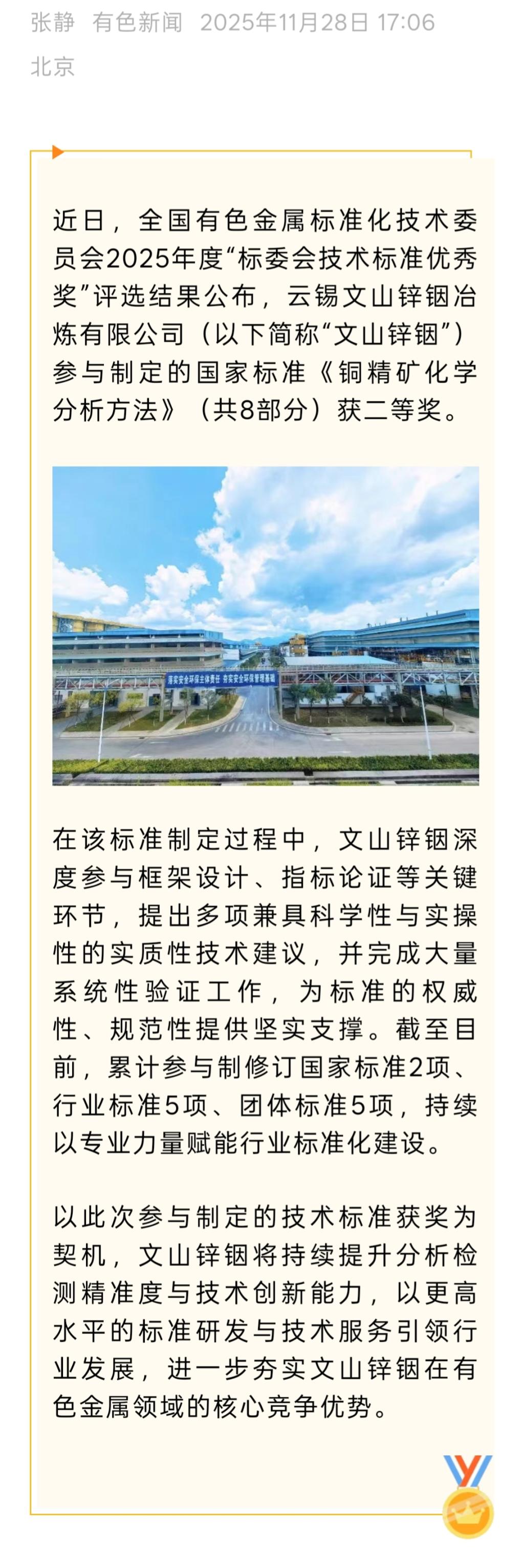 有色新聞:文山鋅銦參與制定的行業標準榮獲全國有色標委會技術標準優秀獎