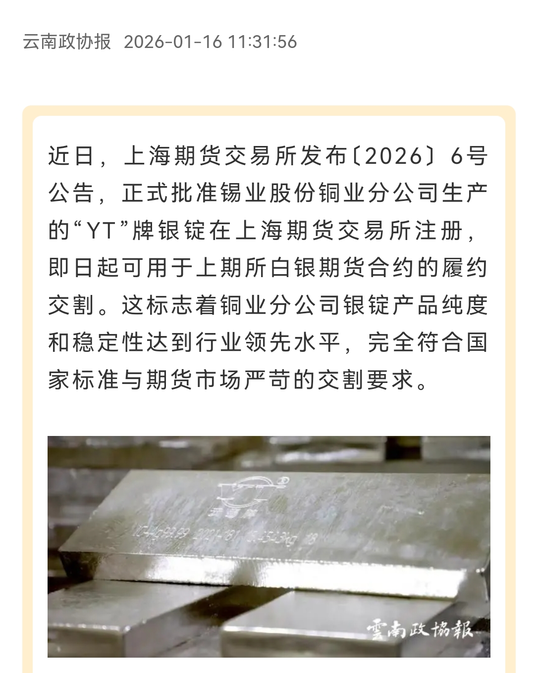 中國有色金屬雜志、云南政協(xié)報:“YT”牌銀錠在上海期貨交易所成功注冊