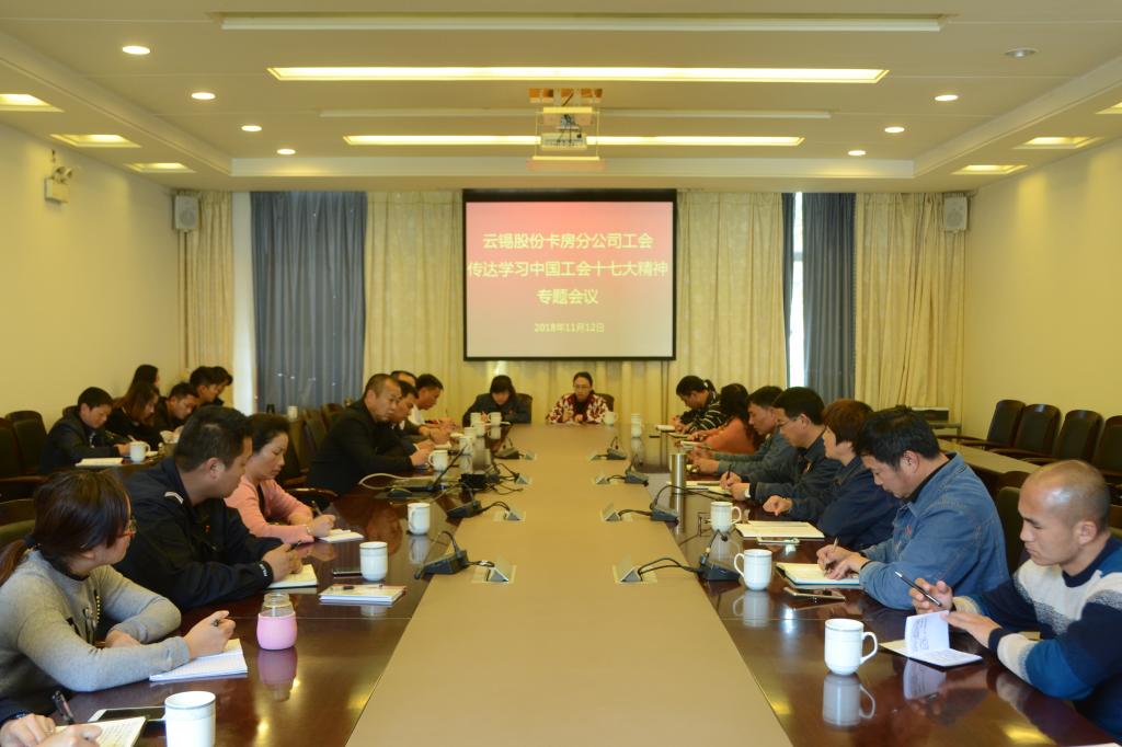 11月12日下午,卡房分公司工會召開學習中國工會十七大會議精神專題會,各部門工會主席、部門工會委員、群工部干事37人參加會議